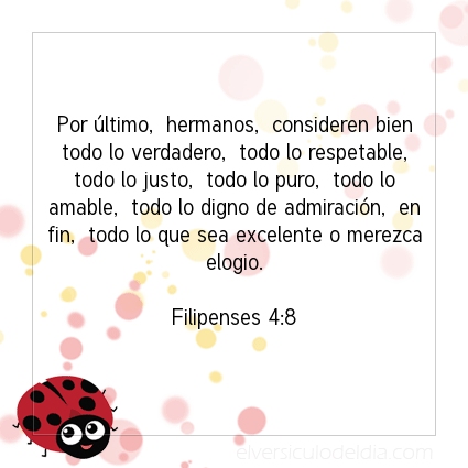 Home Variadas Postal – Por último, hermanos,… Variadas Postal – Por último, hermanos,… 12 Facebook Twitter Google+ Pinterest WhatsApp Por último, hermanos, consideren bien todo lo verdadero, todo lo respetable, todo lo justo, todo lo puro, todo lo amable, todo lo digno de admiración, en fin, todo lo que sea excelente o merezca elogio. Filipenses 4:8 RELATED ARTICLESMORE FROM AUTHOR Postal – Porque el Señor al… Postal – Se le permitió infundir… Postal – Se le concedió dar… Postal – Por lo tanto, … Postal – Manteniendo la fe y… Postal – No te dejes llevar… Postal – El SEÑOR está cerca… Postal – Considerad a aquel que… Postal – En conclusión, ya…